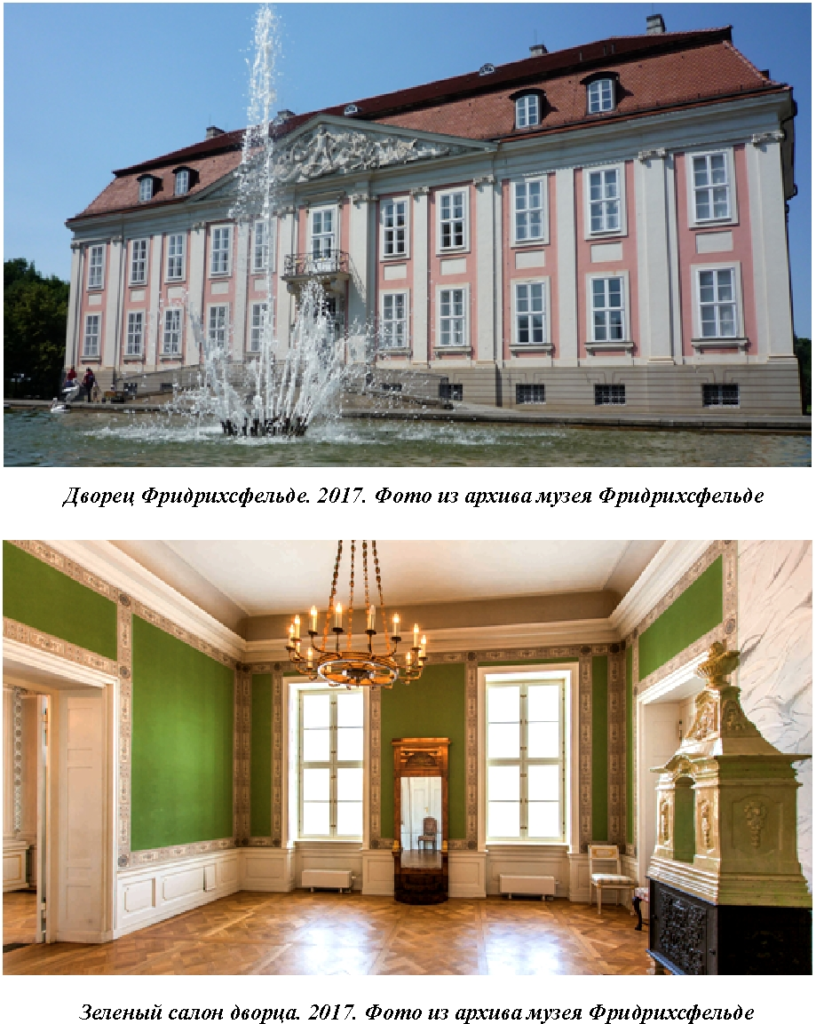 21 Бранденбургский архив. Фонд 37 Единица хранения 1. Отношения между владельцами замка Фридрихсфельде (1717-1849). — С. 79. Дворец Фридрихсфельде в настоящее время расположен на территории Берлинского зоопарка. Был построен в конце XVII в. в стиле классицизма. Первым владельцем дворца был голландский судовладелец Биньямин Рауле,. В XVIII в. здание постоянно «меняло» владельцев, в числе которых была и Е.П. Барятинская. Она, как и другие хозяева внесла свои изменения в облик Фридрихсфельде, но к счастью, они были незначительны и не повлияли на общую архитектуру дворца. Сегодня, несмотря на то, что дворец входит в комплексную экскурсию, являясь частью знаменитого зоопарка, любители архитектуры приезжают часто в этот район Берлина именно ради знакомства с самим зданием. В одном из крыльев дворца находится музей, посетив который, можно составить представление об интерьерах XVIII-XIX вв.