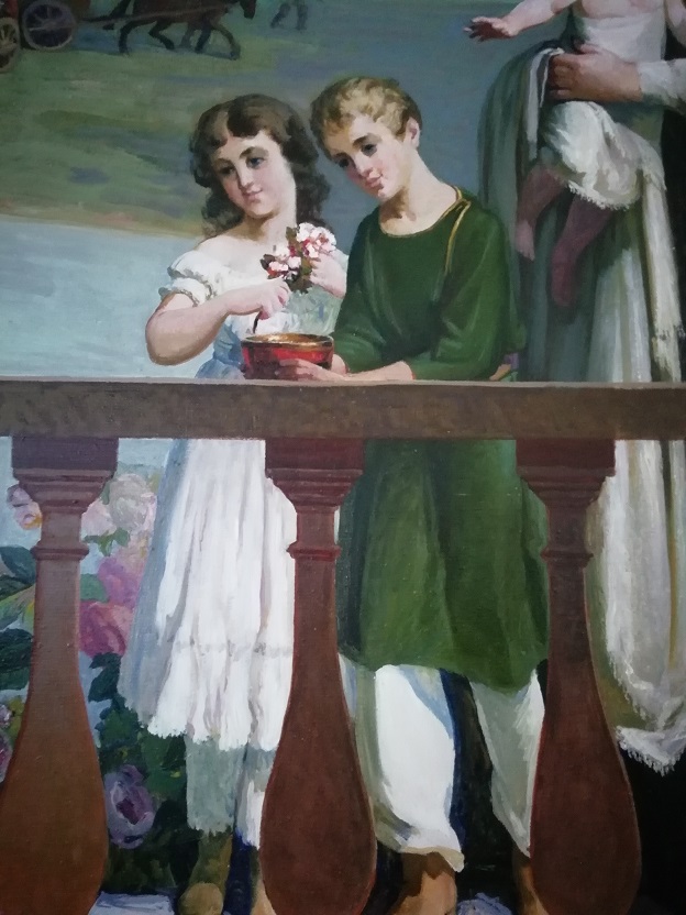 Тем не менее, художник разместил фигурки старших детей в центре и при внимательном рассмотрении мы узнаем среди стоящих: в мальчике с цветком — Александра, а справа — Леониллу и Владимира, на руках кормилицы – совсем маленький Анатолий. Мать их принимала живое участие в жизни крестьянок: заботилась о врачевании, каждой девушке «на выданье» перед свадьбой даровала приданое из личных сбережений…