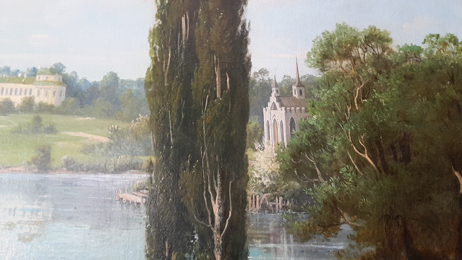Марьино. Сер. XIX в. Фрагмент с видом кирхи. Неизвестный художник.